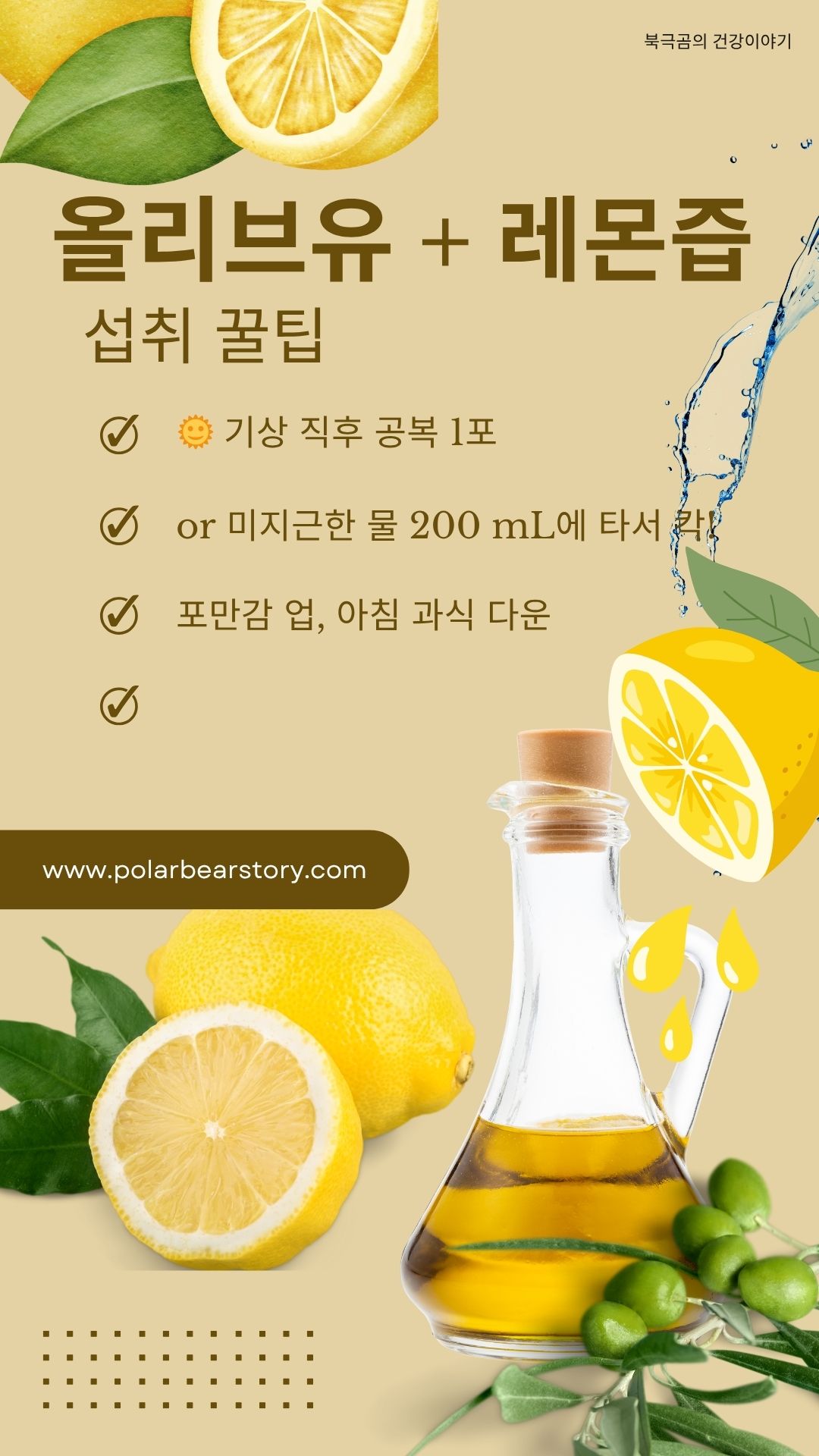 - 지방 흡수율↓ – 레몬의 산(酸)이 소화를 돕고, 올리브유 지방이 비타민 C 흡수를 촉진