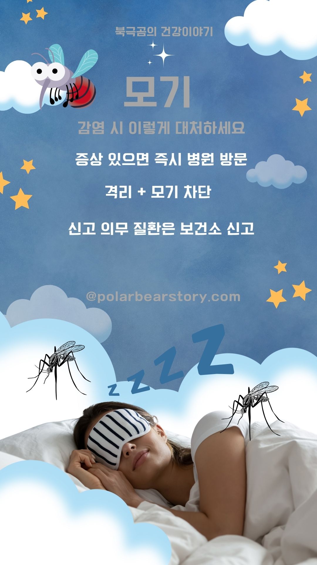 • 모기장이 설치된 방에서 격리하거나, 방충망과 기피제를 사용해 모기 접촉을 최소화하세요.