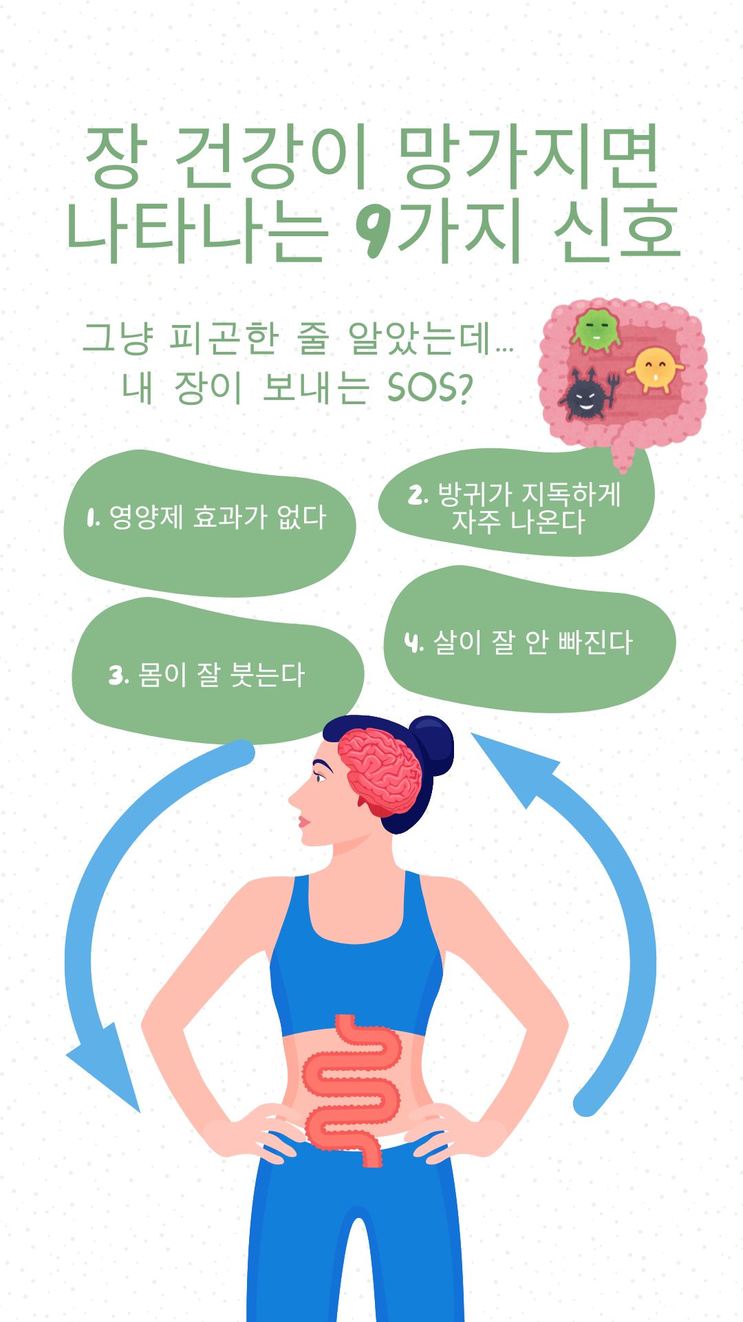 장 건강은 단순히 소화기 문제가 아니라, 전신 건강, 정신 상태, 면역력, 피부 상태까지 영향을 미칩니다. 몸이 보내는 미묘한 신호들을 무시하지 말고, 장이 보내는 SOS에 귀를 기울여야 합니다.