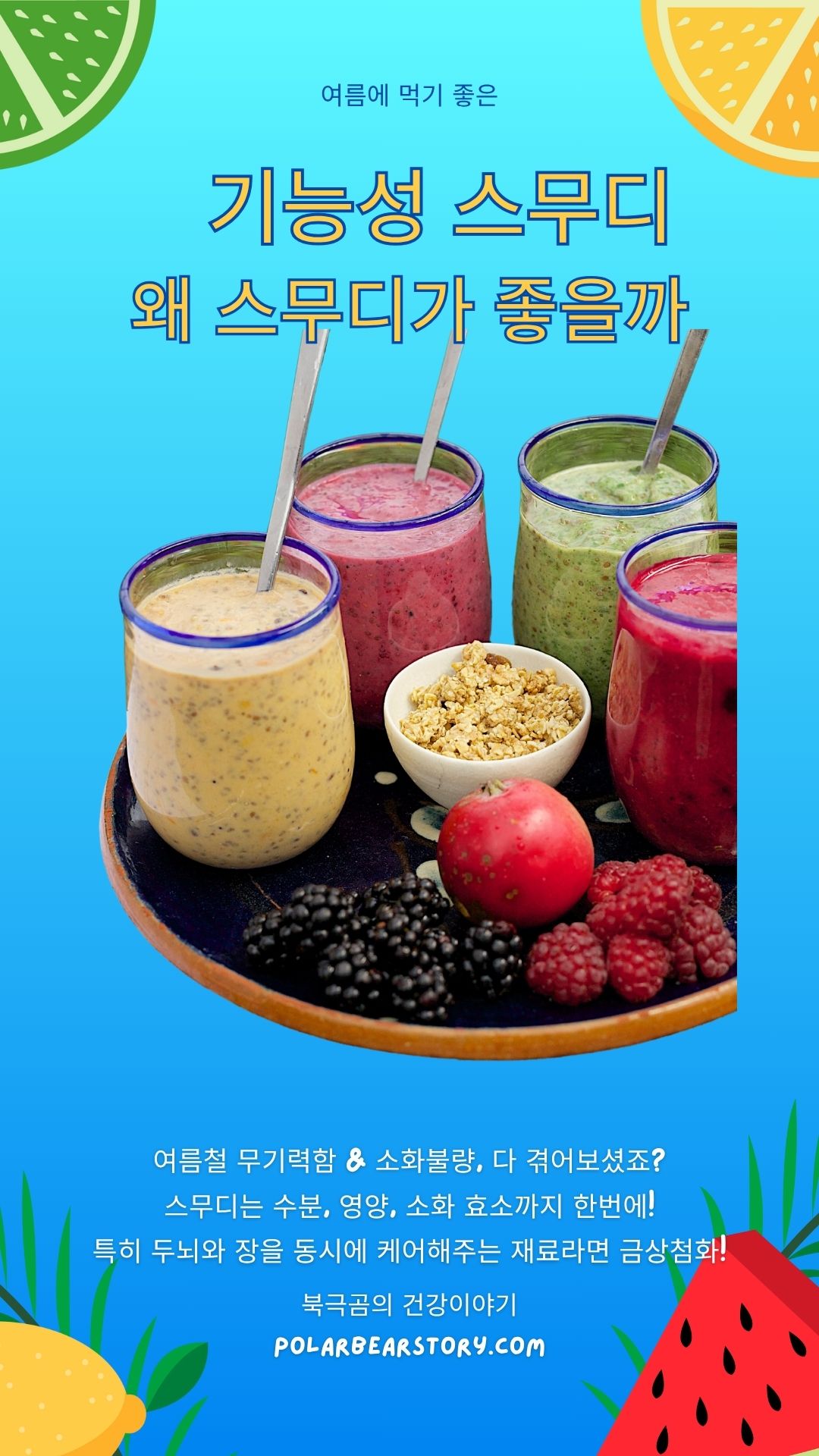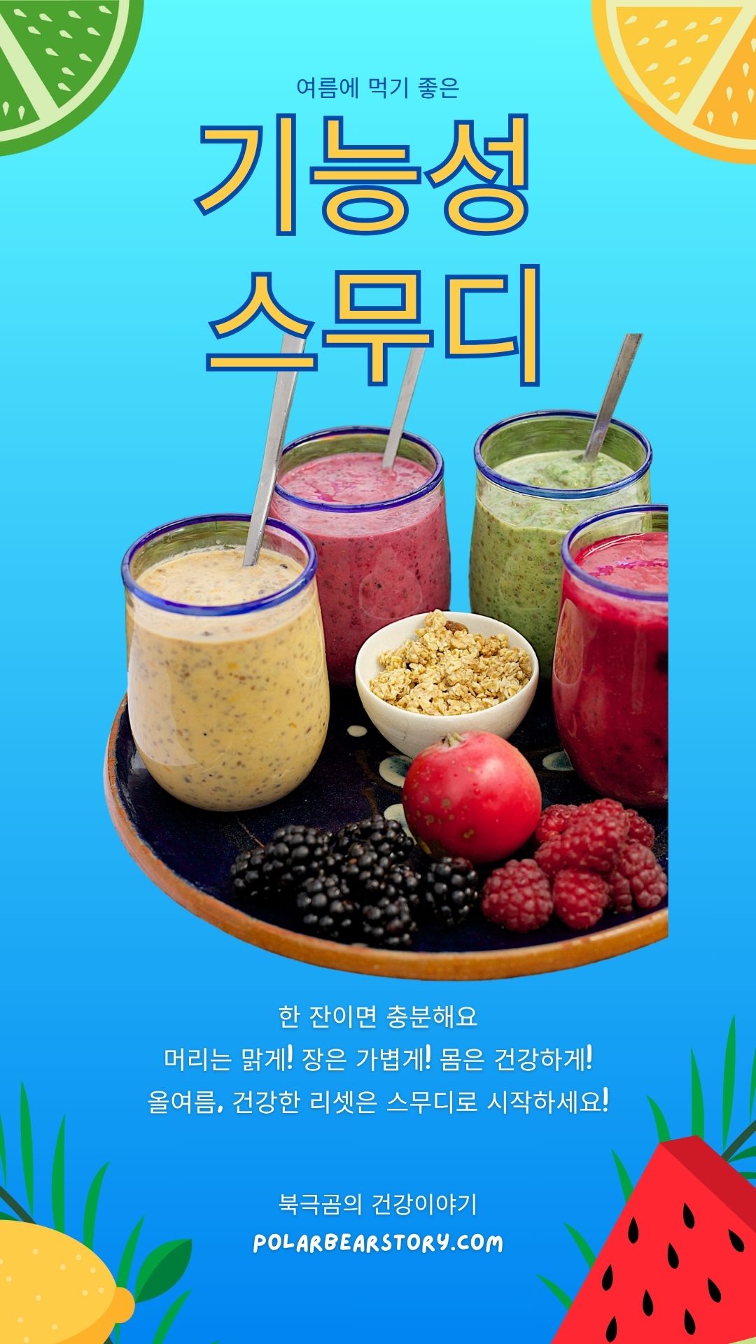 스무디는 단순한 음료가 아니라 '마시는 건강식'입니다. 특히 여름철에는 체내 수분이 쉽게 빠져나가고 소화력이 떨어지기 때문에, 과일과 채소의 영양을 손쉽게 섭취할 수 있는 스무디는 매우 이상적인 선택이에요. 여기에 두뇌 회전과 장 건강을 동시에 챙길 수 있는 식재료를 조합하면 ‘한 잔으로 온몸을 리셋’할 수 있습니다.