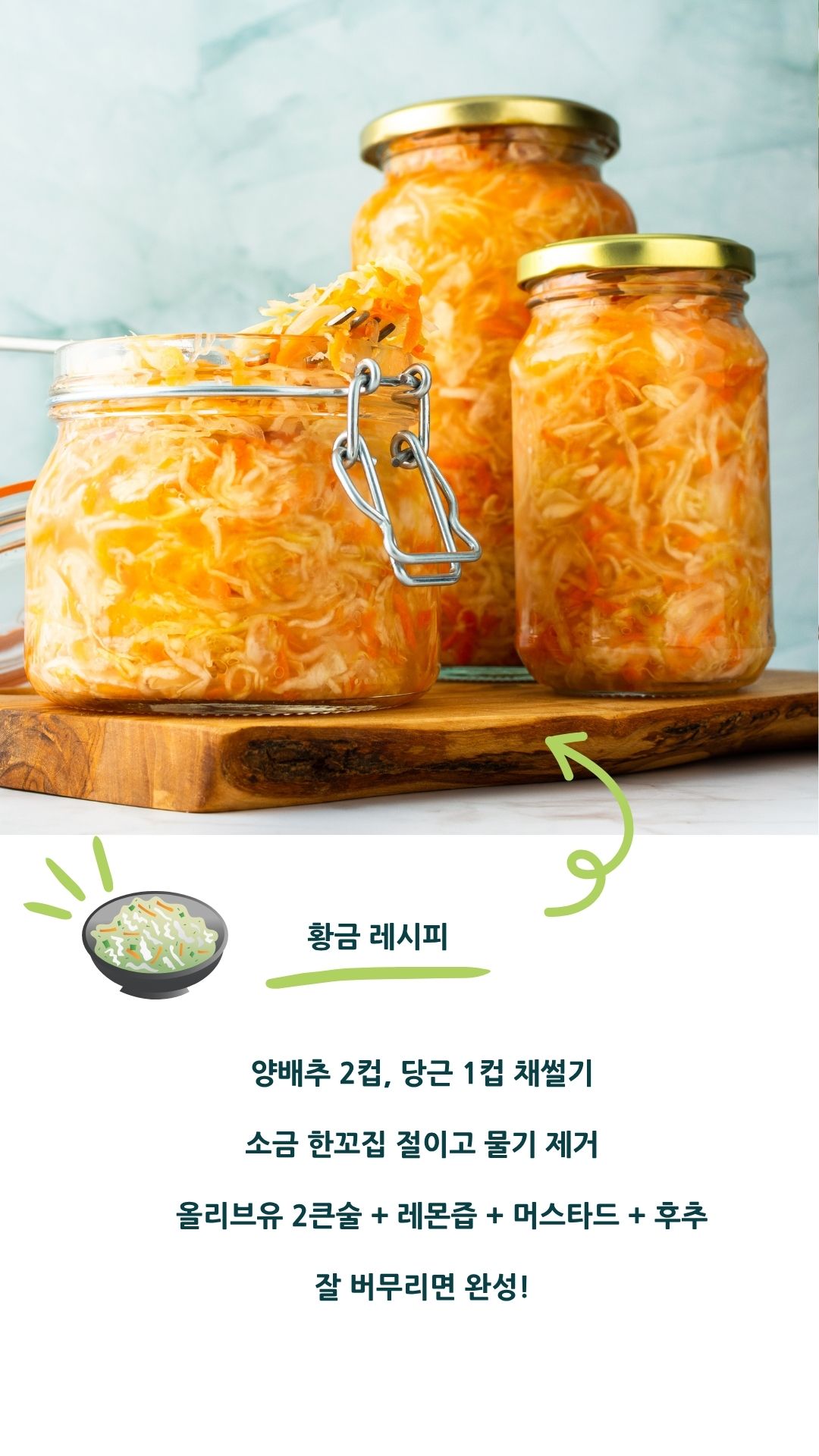 재료: 양배추 2컵, 당근 1컵, 소금 약간, 올리브유 2큰술, 식초 또는 레몬즙 2큰술, 설탕 1작은술, 머스터드 1작은술, 후추 약간