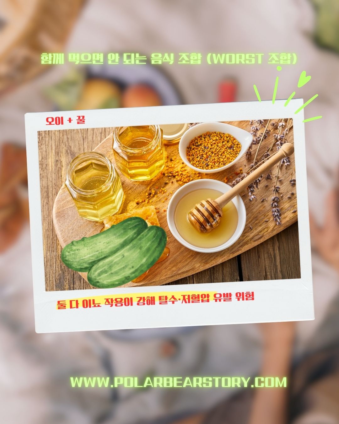 또한 둘 다 찬 성질이라 위장을 차게 만들어 소화불량을 일으킬 수 있죠. 오이와 꿀의 조합도 주의가 필요합니다.
