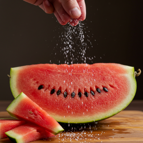 수박에 소금을 살짝 뿌려 먹는 것도 좋은 궁합입니다. 소금이 수박의 단맛을 더해줄 뿐 아니라 나트륨이 수분 흡수를 도와줍니다.