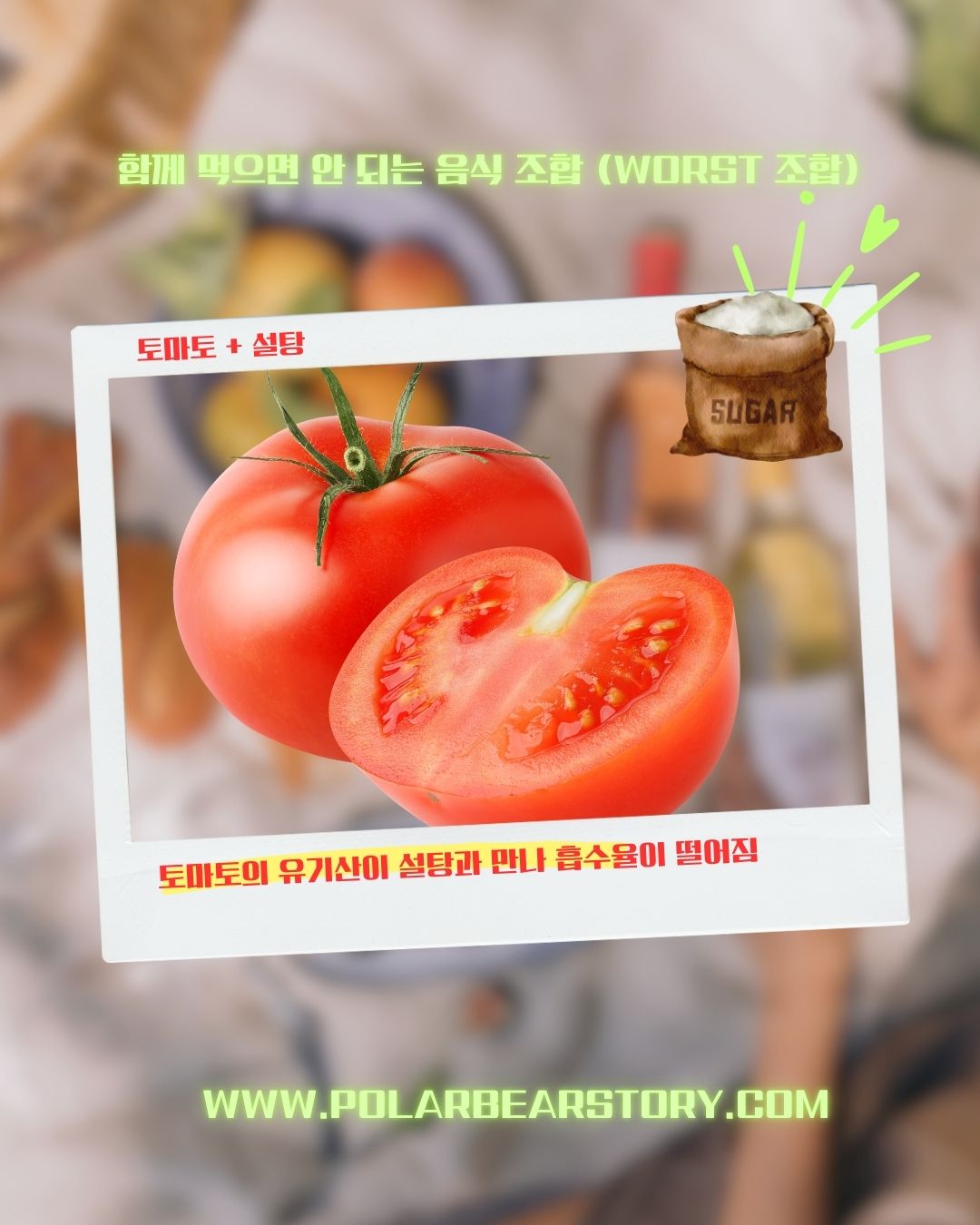 설탕이 토마토의 유기산과 반응해 체내 흡수율을 떨어뜨리고, 오히려 혈당을 빠르게 올릴 수 있기 때문입니다.
