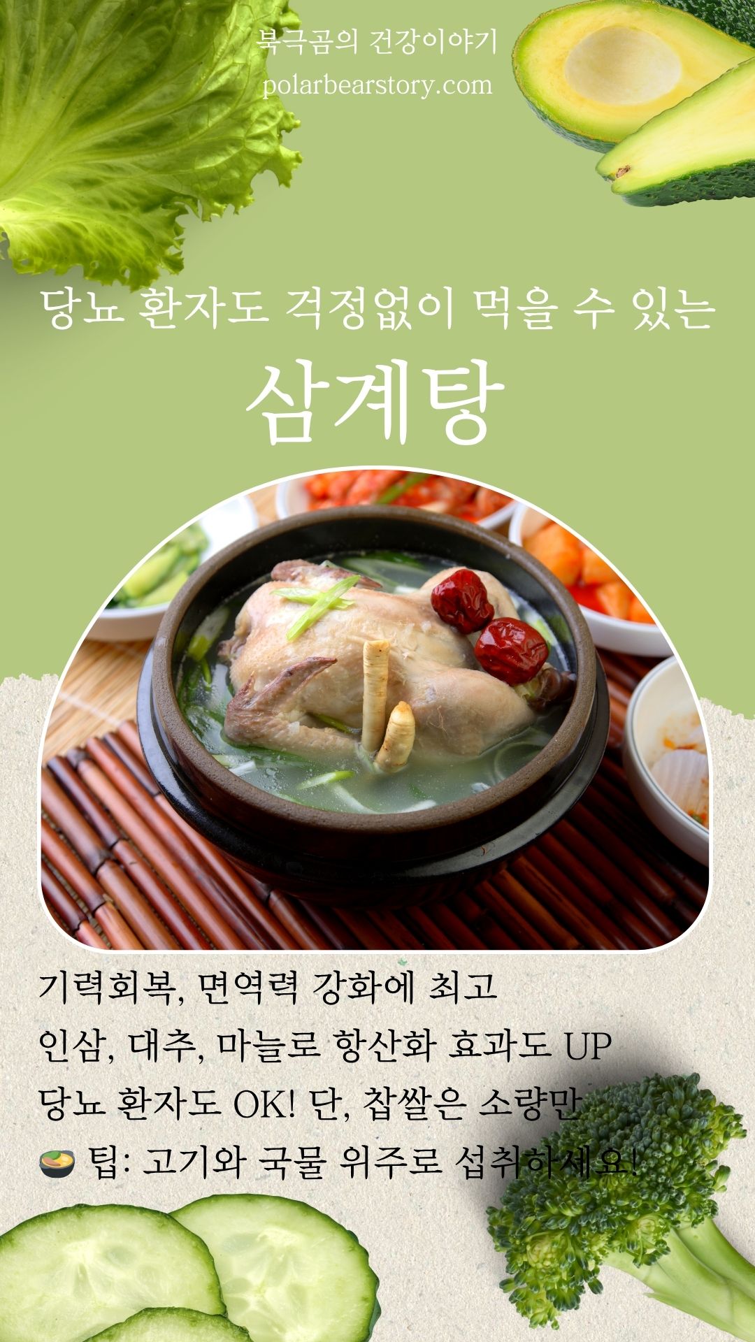 - 레시피 팁: 닭 안에 찹쌀, 인삼, 대추, 마늘을 넣고 1시간 이상 푹 끓이세요. 염분은 줄이고 국물 위주로 섭취하면 부담이 적습니다.
